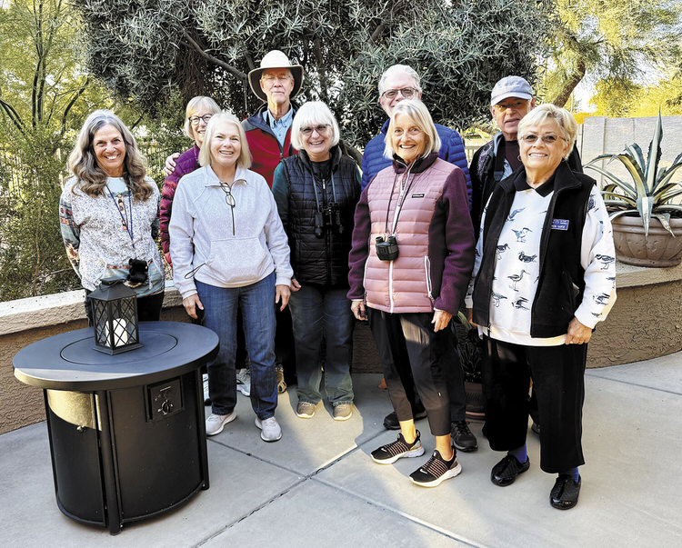 A fledgling birding group has started meeting in PebbleCreek and will be taking short trips to nearby bird watching areas. Our December gathering was at Polly Wimberly and Kirk Brown’s home, where we birded from their patio. We saw and identified several common local birds including Anna’s and Costa’s Hummingbirds, Gambel’s Quail, Eurasian Collared Doves, and Curve-billed Thrashers. Pictured are (from left to right) Marilynn Reynolds, Debbie Johnson, Marilyn Kinnie, Jeff Johnson, Polly Wimberly, Kirk Brown, Ruth Bindler, Gordon Cooper, and Carol Lutz. Photo by Dana Thomas. If you are interested in birding, please contact Dana Thomas at dlthomas@alaska.edu.
