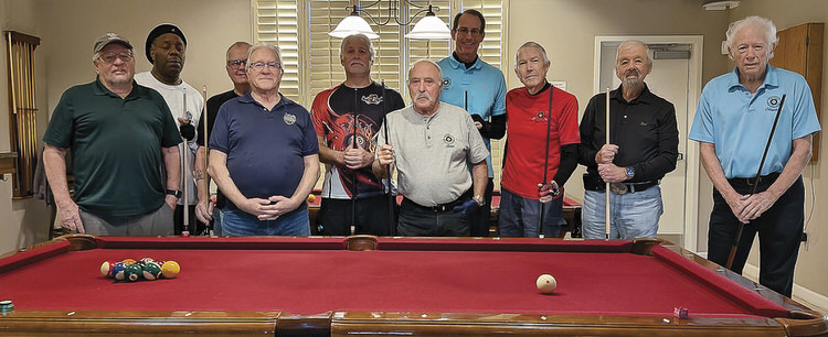 Members of the first-ever contest between Sundance and PebbleCreek Billiards Clubs (from left): Sundance’s Bob Fletcher, Calvin Brown, Neale Smith, Tom Godlewski, and Steve Farmer; PebbleCreek’s Rene Lefebvre, Dan Harris (photographer), Lynn Warren, Bill Frustaglia, and Clay Beeson.