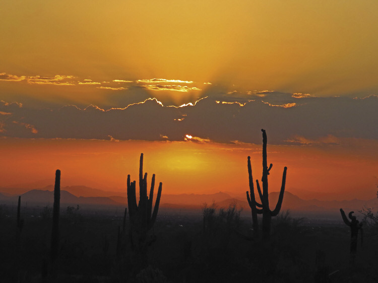 The photo of the month for September is a dramatic capture by club member Lynn Warren of an early morning sunrise in the White Tank Mountain Regional Park, just a short drive northwest of PebbleCreek. The photo was taken in early August from the Mule Deer Trail while on a hike from the library to the popular Waterfall area. One benefit of having monsoon clouds early in the day is an occasional impressive sunrise such as this one, but the window of opportunity is short since the lighting lasts only a few minutes at best. This particular picture was taken with Lynn’s pocket camera at 6:01 a.m. and the crepuscular rays and iconic saguaros lead the eye into the picture. For information about the Camera Club, visit the club website at pebblecreekcameraclub.com or email Keith Cunningham at khcunning@hotmail.com.