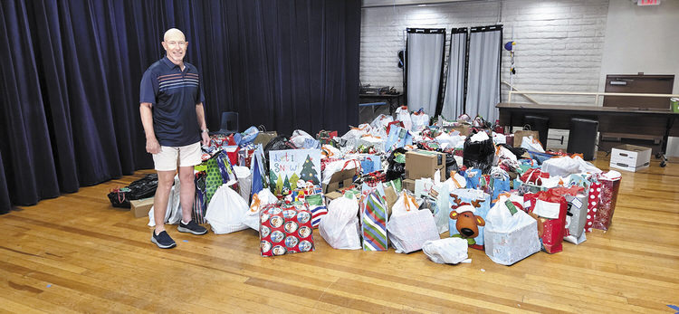 PebbleCreek Democratic Club Veterans Service Committee member Bob Wiedower and the 225 gifts donated by Democratic Club members to a local elementary school (photo by Chuck Veltri)