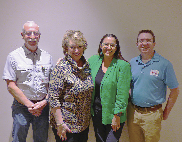 Candidates Brian Matlock, Clara Pratte, and Jonathan Hill join PebbleCreek Democratic Club President Vicki Barber (second from left) at the club’s Feb. 4 meeting at the Tuscany Falls Ballroom.