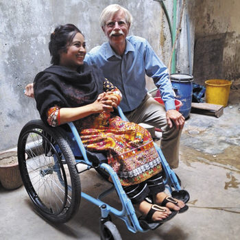 Don Schoendorfer with wheelchair recipient