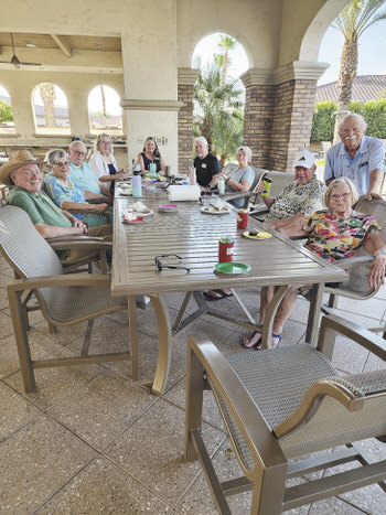PCGC members brave the August heat for a summer potluck—pictured left to right: Mike Burke, Kathy Koch, John Koch, Vicky Ferraresi, Marcia Wallick, Kevin Campbell, Deb Campbell, John Husk, Charlie Lowe, Robbi Lowe. (Photo by Judy Husk)