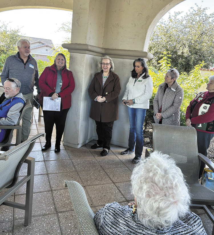 2026 PCGC Board of Directors at the December Club Potluck. Pictured left to right are Vice President Kevin Campbell, outgoing President Marsha Wallick, incoming President Vicky Ferraresi, Member-at-Large Barb Downey, Secretary Mary Winter, and Treasurer Judy Husk. (Photo by Sally Sullivan)