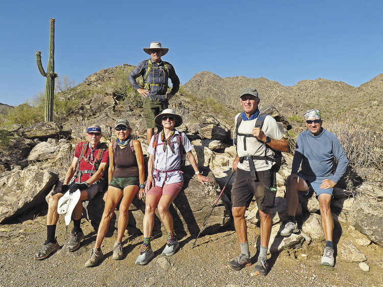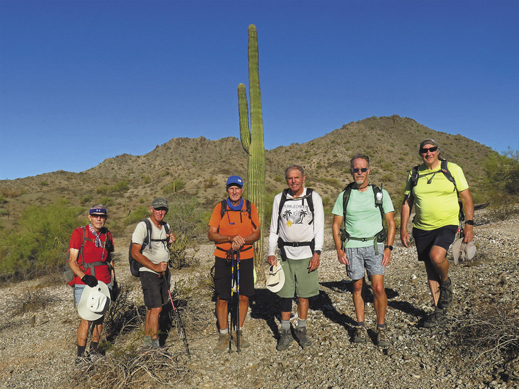 Because of its proximity to PebbleCreek, Estrella Mountain Regional Park has been a frequent destination for PC hikers during the challenging summer heat. On Aug. 4, six PC hikers completed an 8-mile scenic loop on yet another hot morning. The park provides many different trails, including a collection of competitive track trails popular with both bikers and hikers. For this hike, the group combined trails to create a shorter loop, more appropriate for summer conditions. As usual for summer hiking, the group left Eagle’s Nest at 5:30 a.m. and was on the trail by 6 a.m.; the group paused at the saddle on Mountain Pass, the high point for the hike, for a snack break and group photo. The club hikes all around the valley, including summer; visit the club website at pchikers.org for more information and photos.