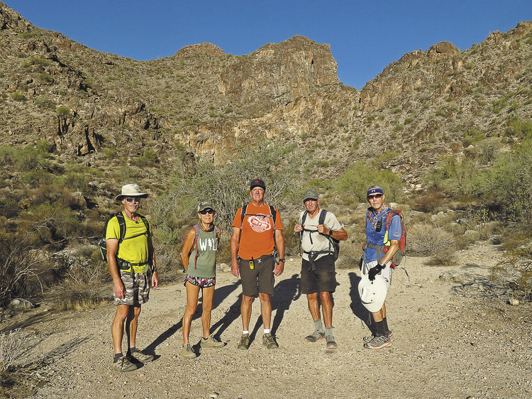“B” hikers normally choose longer, more challenging hikes but on July 30, in deference to summer conditions, chose to conduct an easy, flat 7-mile hike from the White Tanks library to the popular Waterfall. Of course, unless you go immediately after rain, the waterfall is dry, as it was for this hike. The hike was a loop and the group stopped at the windmill oasis for a short break before completing the return to the library. The club hikes all around the valley and offers hikes for most levels of fitness; visit the club website at pchikers.org for more information and photos.