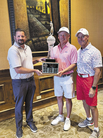 The PCMGA Club Championship trophy was presented to Jeff Benton (center) by Staff Pro Kyle Metzler (left) and PCMGA President Joey Grande (right).