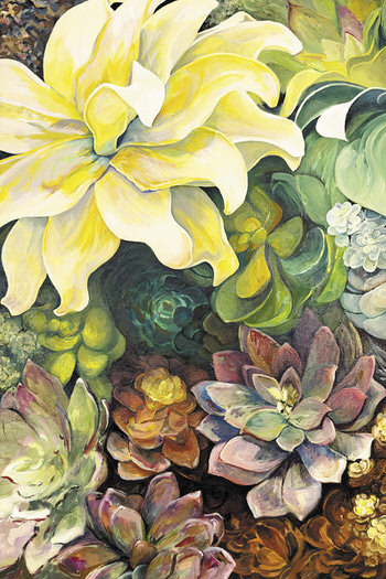Cynthia Lavin won first prize in the oil category for her painting “Deep into Warm and Cool.” She said of the 24×36 inch painting, “I love bringing to life the range of colors, organic shapes, volume, and abstract qualities of succulents.”