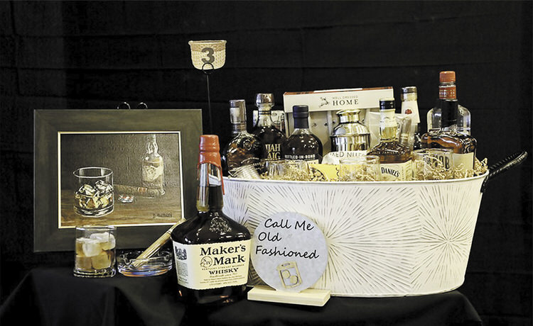 Eight bottles of spirits, cigars, and more are included in the “Call Me Old Fashioned” basket valued at $1,750.
