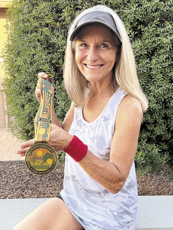 As she and her husband, Terry, returned to their home in the Santa Cruz mountains this summer she utilized her creative side during her healing time. Thinking about the medal design, she knew she wanted to incorporate the beauty surrounding Goodyear. The nearby mountains, the cactus, and the sunall essential elements. She began sketching out ideas until she ultimately came up with the ideal design.