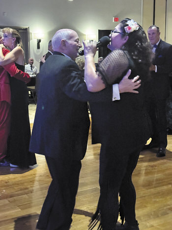 The Rhythm Edition band struck a note and couples and groups formed on the dance floor to wile away the evening under swirling lights. President Ken Minichiello danced his traditional dance with the singer of the band Gloria Robles as she sang into her microphone.