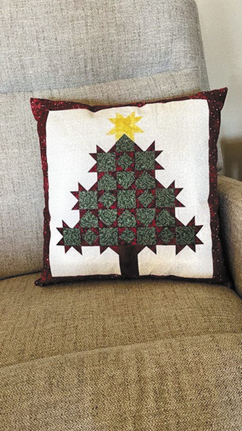 Christmas tree decorative pillow made from blocks of holiday fabric