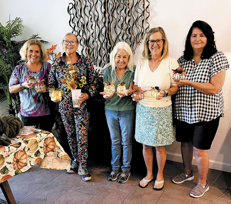 On Nov. 5, Unit 44’s craftiest lady, Jody Hoff, hosted a gathering of like-minded neighbors to make light-up pumpkin table decorations and decoupage fall vases. With many of Jody’s decorative items to choose from, each got to work with glue guns and creativity to enjoy laughs and time together. It was a gathering so nice that all three of our unit’s Debs made it—three Debs and three J’s (Jean Harris not pictured)! From left to right: Jody Hoff, Debbie Baron, Judy Gorski, Deb Fahey, and Deborah Crabtree.