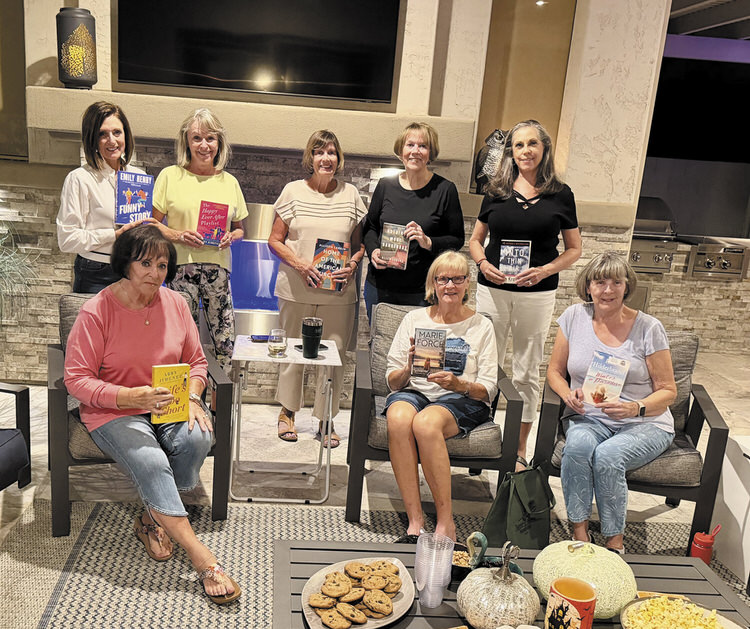 The bi-monthly Books and Booze gathering was held on Oct. 25 in the beautiful outdoor space at the home of Janelle Watts. It was a perfect evening for the group to meet—this time with a little less booze (more boos!) and a few more chocolate chip cookies. Toni Erickson gave a demonstration on how a group headed by Kathy Cheek in PebbleCreek makes mats for the homeless using plastic bags. The rest of the evening was spent sharing book recommendations—what to read, what to skip—and passing along books to exchange.