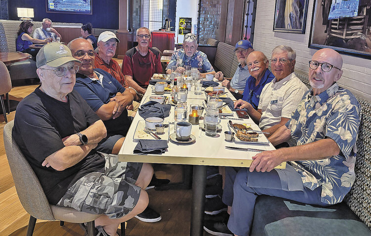The men also shared news about neighbors and learned about a new neighbor who just moved in. All were glad to get together after a long summer and are looking forward to next month’s breakfast when more snowbirds arrive to share their stories of their summer adventures. Around the table (clockwise from the left foreground) were Bob Millikan (rocking the red shirt), Doug Kirkpatrick, Wayne Thomas, Don Paxton, Spike Razem, Dan Harris (photographer), Bob Adkins, Mike Stepien, and Paul Fahey.