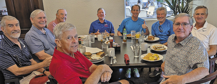 The men also shared news about neighbors and learned about a new neighbor who just moved in. All were glad to get together after a long summer and are looking forward to next month’s breakfast when more snowbirds arrive to share their stories of their summer adventures. Around the table (clockwise from the left foreground) were Bob Millikan (rocking the red shirt), Doug Kirkpatrick, Wayne Thomas, Don Paxton, Spike Razem, Dan Harris (photographer), Bob Adkins, Mike Stepien, and Paul Fahey.