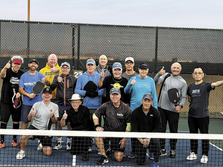 At 7:45 a.m. on Dec. 29, 2025, with sun still on the rise, the smiling PC Pickleball AM Group, standing L to R: Randy Hurwitz, Jeremy Lipton, Jon Peterson, Rob Gold, Jeff Jacobsen, Mark Hohnbaum, Jim Soileau, Joe Lorino, Brett Rodgers, Mark Sundsten, Din Chen; kneeling L to R: Spike Razem, Bob Funkhouser, Steve Striker, Victor Villaflor; absent/photographer: Corinne Razem